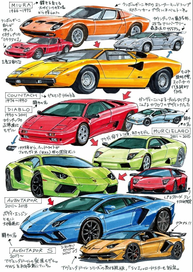 私的イラスト傑作選(310) ル・ボランで連載していた「車系譜MANDA-LA」。 1枚絵にクルマごとの系譜を収め、歴史を紐解きます。 2021年7月号(2021/5/26発売)のお題は「フラッグシップ・ランボルギーニ」でした。 バックナンバーでご覧になれます。ぜひどうぞ! ↓ .jp/product/2809/b ランボルギーニ 2024.02.22 遠藤イヅル @ie_andre?utm_source=yjrealtime&utm_medium=search